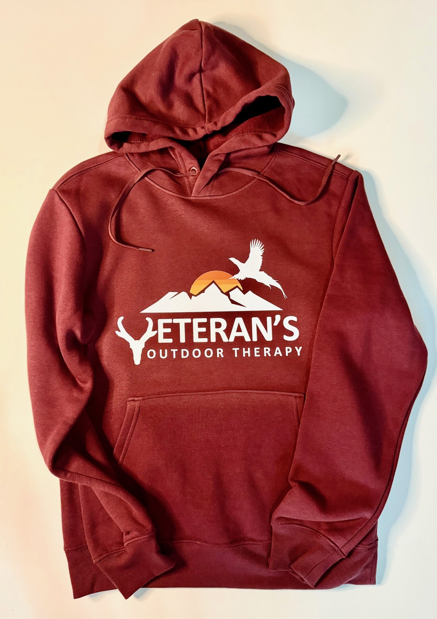 A comfortable maroon pullover hoodie featuring the Veteran’s Outdoor Therapy logo, perfect for everyday wear, outdoor adventures, and supporting the mission.