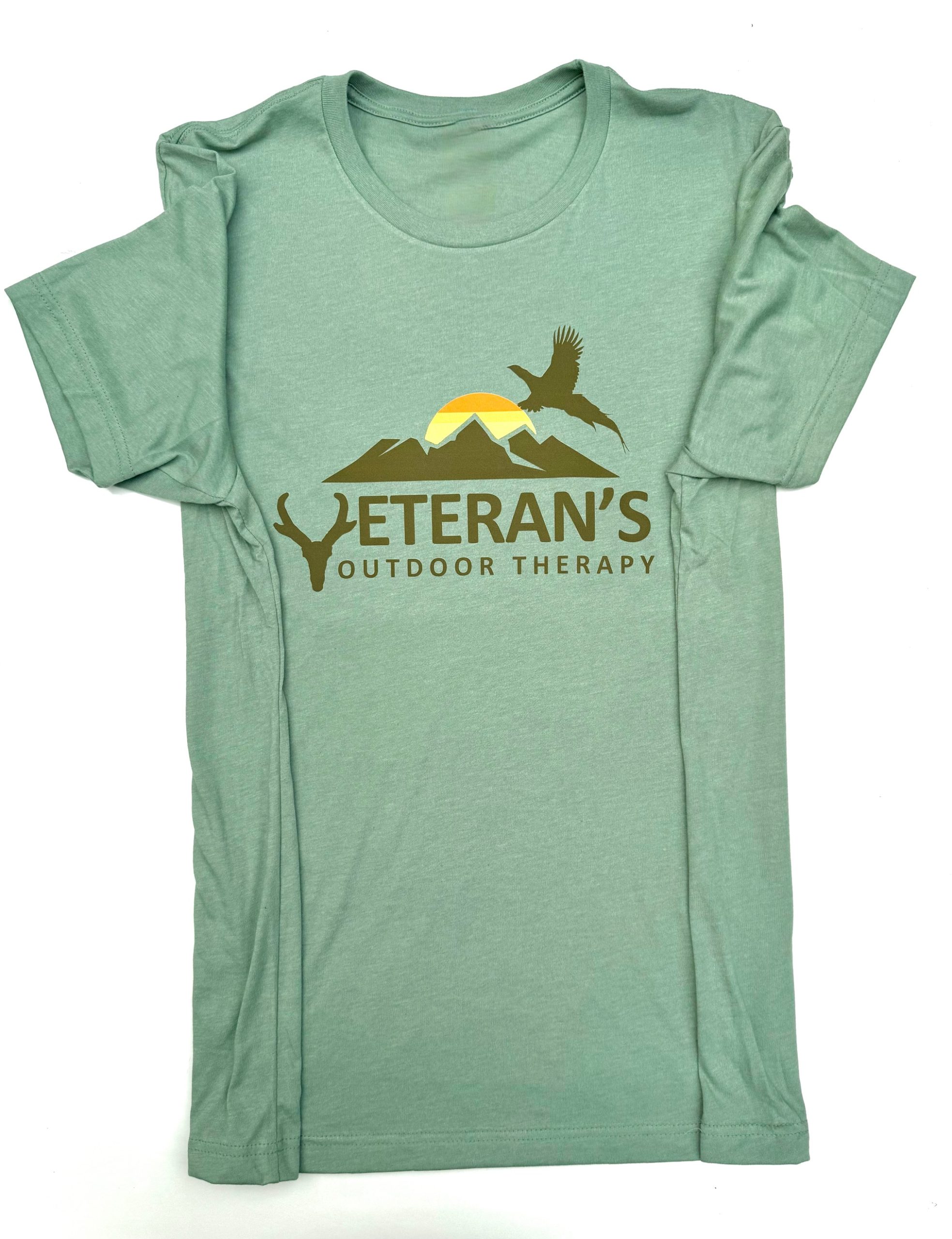 A soft sage-green tee featuring the Veteran’s Outdoor Therapy logo—where mountains, wildlife, and the outdoors symbolize healing, resilience, and purpose.