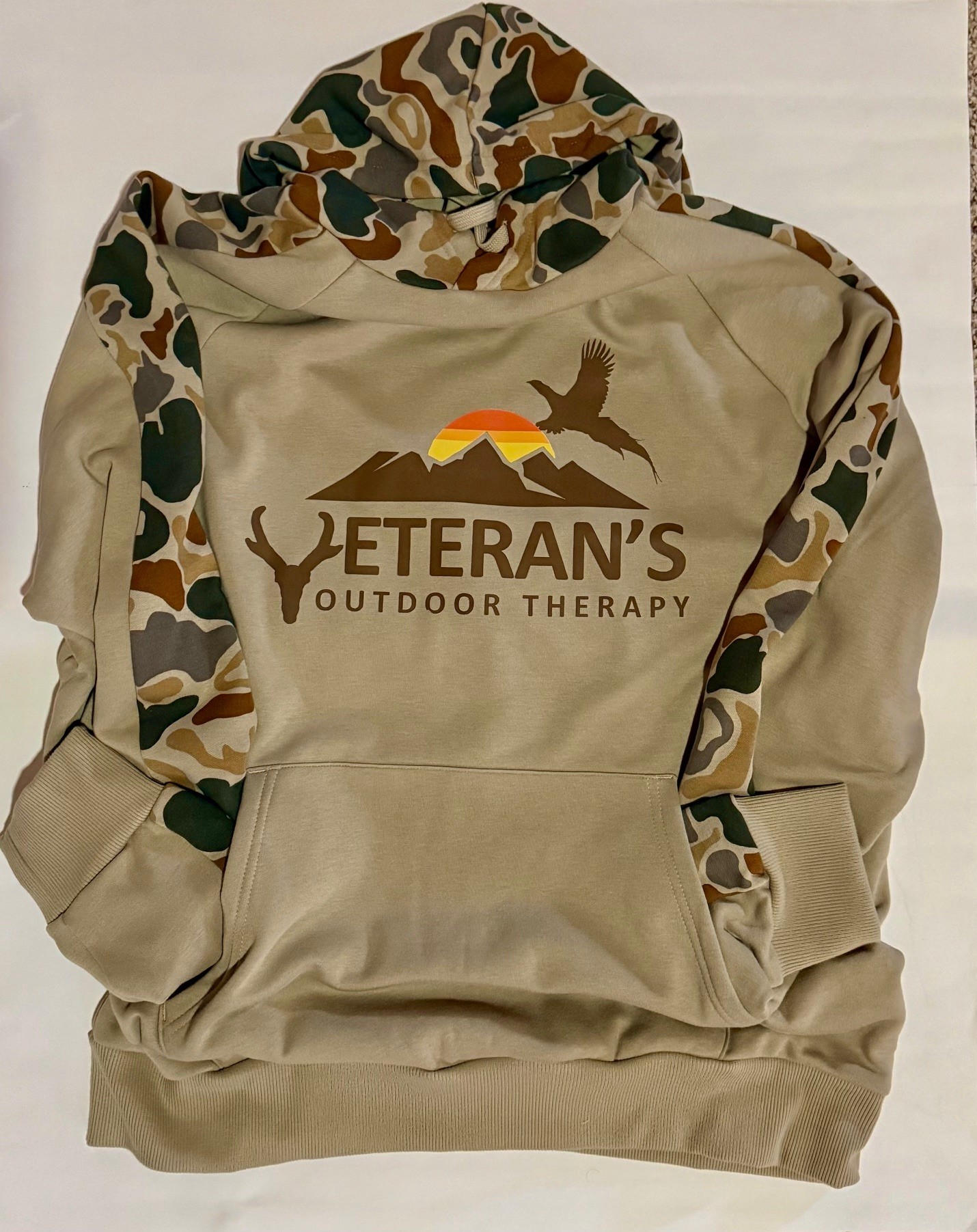 A premium tan hoodie with camouflage sleeves and hood, featuring the Veteran’s Outdoor Therapy logo—built for comfort, purpose, and life outdoors.
